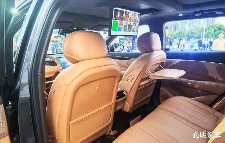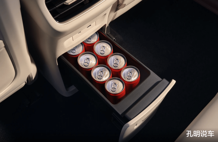 而且在长轴距的条件下并没有去追求座椅的数量,这款东风风神L8就是主打大5座的后排空间体验,所以内部可施展的空间配置就丰富多了,首先后排大沙发明显坐垫延长,而且提供有折叠小桌板,车顶的折叠大电视,以及容量不错的抽拉式冰箱,内部塞进去8瓶可乐是没问题的。