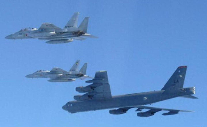 十二月十日,美国空军两架B-52H战略轰炸机与日本航空自卫队的3架F-35A隐形战斗机和3架F-15J战斗机在日本海上空组成编队,进行了协同飞行训练。日本防卫省在次日发布的公告中强调,此次行动展示了美日同盟“不允许单方面通过武力改变现状的坚定决心”。